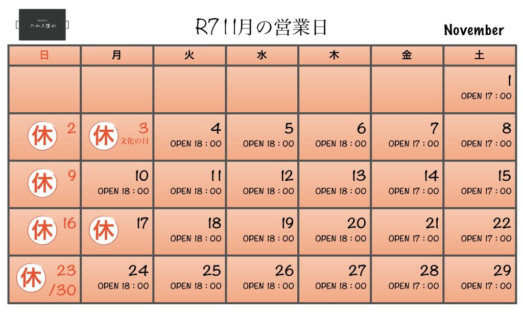 ❗️11月営業日のお知らせ❗️ 2025年10月31日 最終更新日時 : 2025年10月31日 tanukigakure いつも当店をご利用いただき、誠にありがとうございます。11月は日曜定休で、3日(月)、17日(月)、と臨時休業をいただきます。お出かけの際はお気をつけください。
